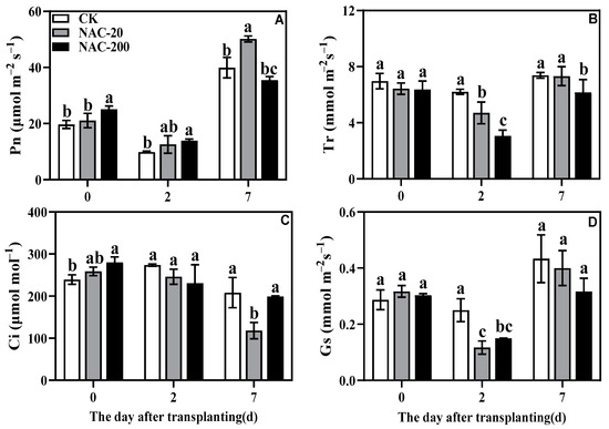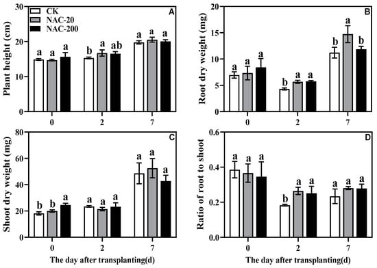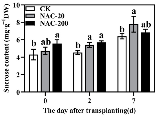 3.2. NAC Priming Improves the Photosynthetic Capacity and Promotes the Accumulation of Sucrose and Dry Matter of Machine-Transplanted Rice under Transplanting Injury