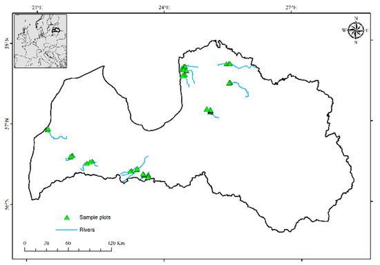 The study was conducted in the hemiboreal zone in Latvia (55.40°–58.05° N and 20.58°–28.14° E). We selected 15 streams shorter than 100 km (Figure 1), which flowed through forest complexes (at least four km along the stream). Selected riparian forests were generally mixed forests, dominated by Norway spruce (Picea abies L.), Scots pine (Pinus sylvestris L.), grey alder (Alnus incana L.), birch (Betula spp.), black alder (Alnus glutinosa L.) and European aspen (Populus tremula L.). The dominant forest vegetation types were Aegopodiosa, Hylocomiosa and Vacciniosa, but almost all forest types were represented in sample plots.