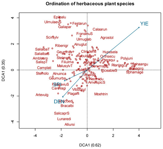 We performed detrended correspondence analysis (DCA) for each of the three vegetation species categories C1, C2 and C3 (Figure 2 and Figure 3). The ordination of the combined data from C1 category (DCAC1) gave the following eigenvalues for the first and second axes: 0.62 and 0.35. DCAC1 shows the species composition among different sites with different forest types. Total yeld had a significant correlation (R = 0.44; p < 0.05) with Hylocomiosa and Vacciniosa forest vegetation species (Calamagrostis arundinacea L., Agrostis stolonifera L., Ribes spicatum E. Robson, Huperzia selago L., Orthilia secunda L., Rubus saxatilis L., Mycelis muralis L., Melampyrum pratense L., Corylus avellana L., Trientalis europaea L., Pleurozium schreberi, Sphagnum angustifolium and Sphagnum girgensohnii) (Figure 2). Total yield and SPI had a significant correlation (p < 0.05) with specific species (Figure 2), but the variation is low (R2 < 0.1). DCAC1 also represents the distribution of dominant forest vegetation types—Aegopodiosa, Hylocomiosa and Vacciniosa. Of all the vascular plants, 47 species had Ellenberg indicator values for nitrogen 7–10, indicating their ability to grow in fertile soils. Furthermore, species that prefer sites rich in nitrogen (for instance, Aegopodium podagraria L., Urtica dioica L., and Stellaria media L.) were found in fertile soils and in presence of Alnus incana L. and Padus avium Mill. Mosses that prefer fertile soils were Plagiomnium affine, Plagiomnium cuspidatum and Eurhynchium angustirete. Grass species that preferred oligotroph conditions were Molinia caerulea L., Deschampsia flexuosa L., Calamagrostis arundinacea L., and Poa nemoralis L., but mosses found in oligotroph soils were mostly Polytrichum commune, Polytrichum juniperinum, Ptilium crista-castrensis, Dicranum majus, Sphagnum angustifolium and Sphagnum girgensohnii. These species were found in the presence of Picea abies L. and Betula pubescens Ehrh.