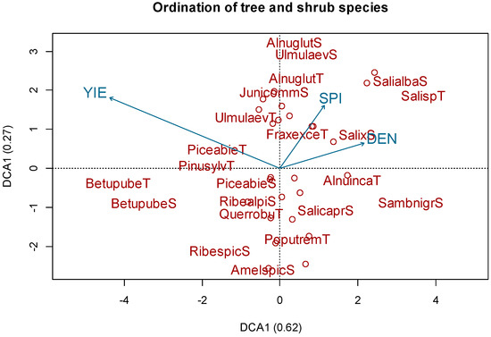 Grouping of tree and shrub species: results of detrended correspondence analysis. Analyzed factors: density (DEN), stream power index (SPI), total yeld (YIE). Letters “T” and “S” at the end of words represent the tree or shrub layer that they were classified into.