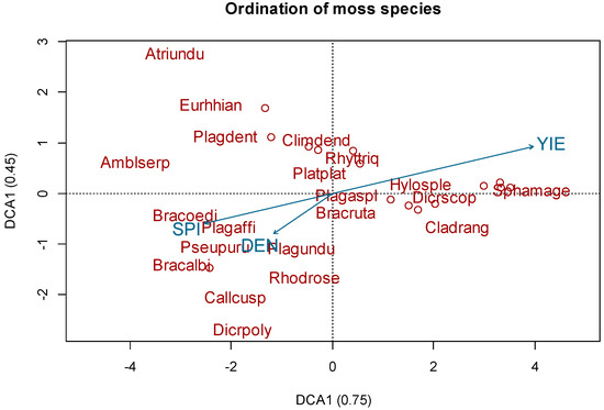 Grouping of moss species: results of detrended correspondence analysis. Analyzed factors: density (DEN), stream power index (SPI), total yeld (YIE).
