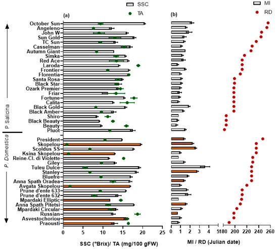 The maturity index (MI) is the ratio between the SSC and TA (SSC/TA) contents that represents a reliable indicator of a cultivar’s suitability for acceptance by consumers [41]. The variation in the MI was higher than in the SSC (CV% = 50 and 17, respectively). The MI varied between 6.1 and 35.1, with the highest values in European plums ‘Stanley’, Tuley Dulce’, ‘Scoldus SS’, and ‘Skopelou’. Among the Japanese plum cvs ‘October Sun’, ‘Sun gold’, and ‘Pluot’ had the highest SSC and MI (means of 18.6 °Brix and 1.7, respectively). The earliest ripening cvs, ‘Shiro’, ‘Black Beauty’, and ‘Beauty’, had the lowest SSC and MI (means of 9.1 °Brix and 0.7, respectively) (Figure 1). Fruit from the cv ‘Shiro’ was also shown to have a low acceptance level in the study by Myracle et al. [42].