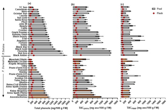 Mean (±SE) (a) total phenol content (mg gallic acid equivalent/100 g FW), (b) total antioxidant capacity using the DPPH (TACDPPH), and (c) the FRAP radical (TACFRAP) (mg ascorbic acid equivalent/100 g FW), in fruit peel (solid bars) and flesh (rhombus) tissue of 43 European and Japanese plum cvs. Colored columns represent local cultivars. LSD: TPs–peel, 143.5; TPs–flesh, 40.5; TACDPPH–peel, 181.1; TACDPPH–flesh, 38.3; TACFRAP–peel, 172.4; TACFRAP–flesh, 15.9.