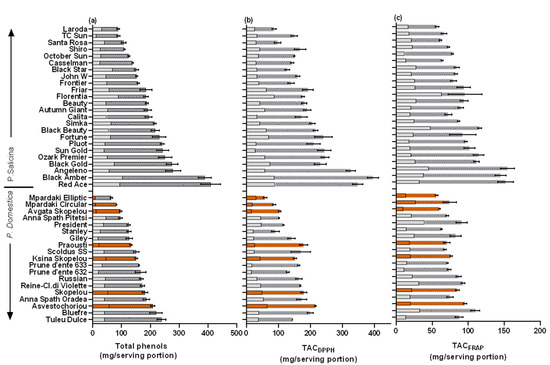 Fruits from the Japanese cvs contained higher TPs–serving compared to European plums (an increase by 1.3-fold) and varied among the studied cvs by 4.6-fold (88.1–409.2 mg/100 g FW) (Table 2, Figure 3). Higher values of TPs–serving were found in ‘Red ace’, ‘Black Amber’, and ‘Angeleno’. Similarly, fruit from the cv ‘Black Amber’ was previously separated for having a high TP and antioxidant capacity when compared to other Japanese plum cvs (5 cvs, Lozano et al. [48]; 17 cvs, Wolf et al. [18]). Moreover, Gil et al. [8] similarly found high TPs and antioxidant content in ‘Angeleno’ fruit compared to four other cvs. In the present study, the lowest values of TPs–serving were found in ‘Laroda’, ‘T.C. Sun’, and ‘Santa Rosa’. The range of TPs found was similar to those reported for other Japanese plum cvs (227–383 mg GAE/100 g FW in 10 cvs, Venter et al. [16]; 317–761 in 5 yellow flesh genotypes, DiNardo et al. [17]; 51–430 in 15 cvs, Wolf et al. [18]).