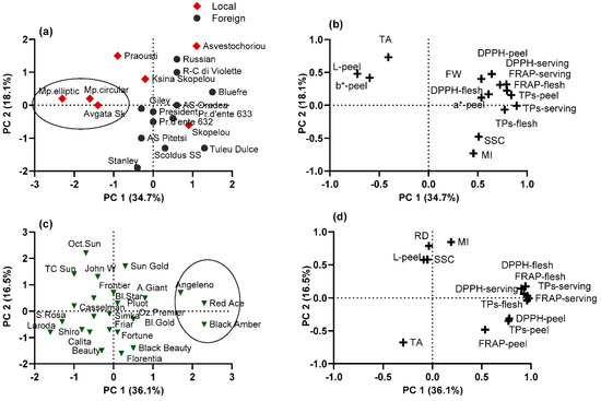 (a,c) Segregation and (b,d) factor loadings, of (a,b) 19 European and (c,d) 24 Japanese plum cultivars, on the basis of fruit physical and chemical characters, determined by principal component analysis. Variable annotations are presented in Table 3.