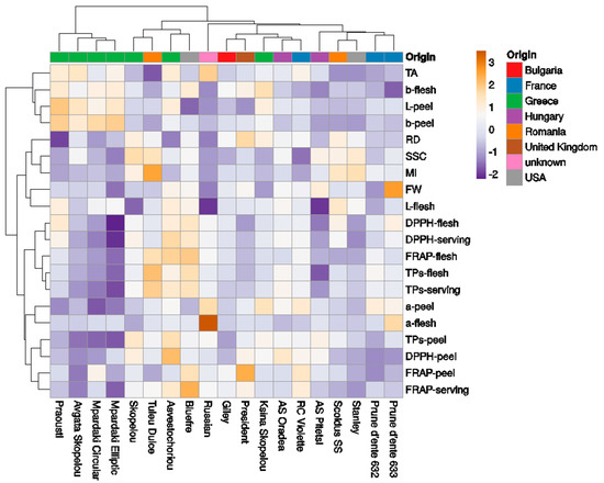 Heatmap showing the clustering of fruit phenotyping traits in 19 European plum cultivars using the ClustVis software. The columns correspond to the cultivars and the rows correspond to the fruit phenotypic traits studied. Both the rows and columns were clustered using Euclidean distance and the Ward method.