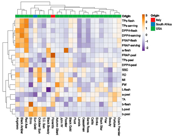 In the Japanese plum cvs, the most important parameters incorporated into PC1 were the total phenol and antioxidant contents (in the peel, flesh, and serving portion) (36.1% of variance); ‘Black Amber’, ‘Red Ace’, and ‘Angeleno’ were separated with high values. PC2 (18.1% of variance) was positively correlated with the ripening date, L–peel, SSC, and MI and negatively correlated with the TA; the cvs ‘October Sun’, ‘Sun Gold’, ‘John W’ and T.C. Sun’ had high values (Figure 4c).