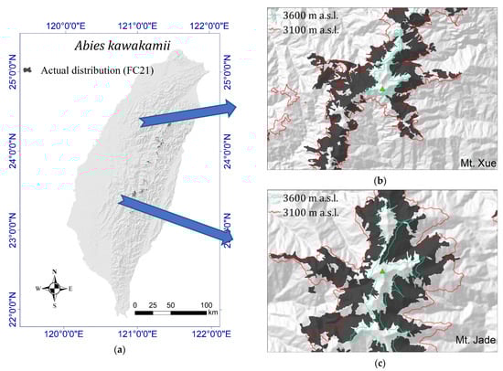 | Range of 3100–3600 m contours | 25,571 | Potential | The altitude range of A. kawakamii forests observed in the field [24,50] |
