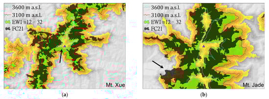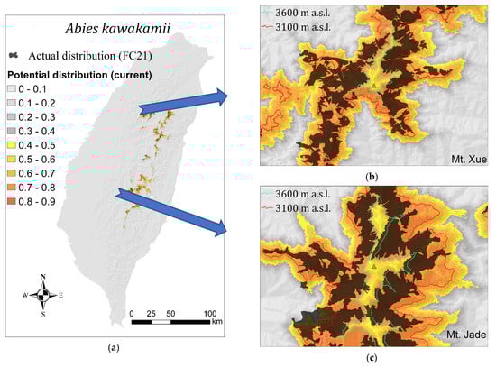 | Range of EWI (effective warmth index) = 12–32 | 20,922 | Potential | Use of the more ecologically significant thermal index (relative to the altitude) to estimate the temperature niche of the A. kawakamii forest belt [46] |