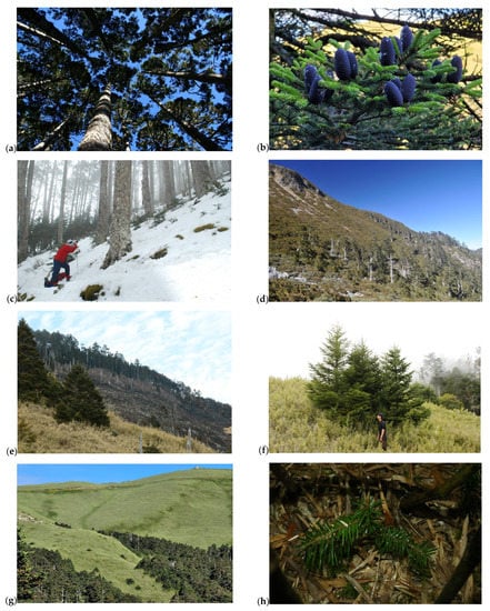 - Liao, M.C.; Tsai, S.T.; Wang, W.; Tzeng, H.Y.; Ou, C.H. Study on population structure of Abies kawakamii (Hayata) Ito in East Xue Trail of Xue Mountain. Q. J. For. Res. 2013, 35, 1–14. [Google Scholar]
