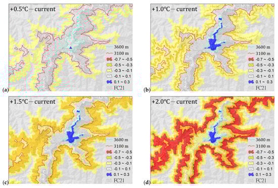 | +2.0 °C | Low loss: 2923 ha Medium loss: 4588 ha High loss: 8709 ha Total area of loss: 16,220 ha (96.2%) | Low loss: 4992 ha Medium loss: 25,904 ha High loss: 40,282 ha Total area of loss: 71,178 ha (97.3%) Low gain: 475 ha |