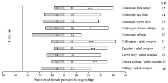 Figure 1. Olfactory responses of female Aphelinus varipes to the odors of five healthy plant species and the host–aphid complex compared to clean air. N.R indicates the non-responders’ female parasitoids. * p < 0.05, *** p < 0.0001, for χ2 test.