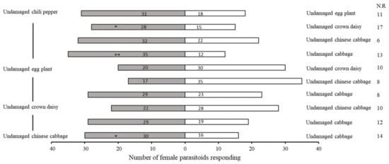 Figure 2. Olfactory responses of female Aphelinus varipes to the odors of undamaged host plants. N.R indicates the non-responders’ female parasitoids. * p < 0.05, ** p < 0.001, for χ2 test. An asterisk denotes a significant difference between odors tested.