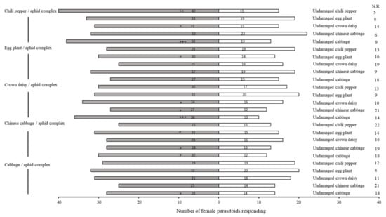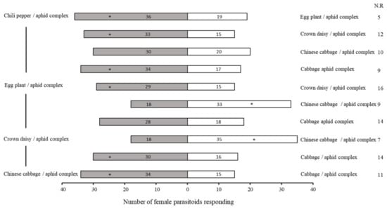 Figure 4. Olfactory responses of female Aphelinus varipes to the odors of aphid/plant complexes compared with aphid/plant complexes with other hosts. N.R indicates the non-responders’ female parasitoids. * p < 0.05, χ2 test. An asterisk denotes a significant difference between odors tested.