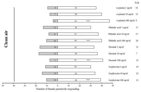 The parasitoid A. varipes was more attracted to the highest of the HIPV doses tested for at 100 ng/μL (α-pinene: χ2 = 36.255, df = 1, p < 0.0001; decanal: χ2 = 24.083, df = 1, p < 0.0001; phthalic acid: χ2 = 18.00, df = 1, p < 0.0001; isophorone: χ2 = 17.163, df = 1, p < 0.0001) compared to clean air (Figure 5). Moreover, lower doses of one-tenth and one-hundredth of these attractant doses were also attractive to the parasitoid compared to clean air but not as much as 100 ng/μL.
