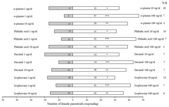 The parasitoid A. varipes surprisingly preferred all HIPV chemicals at a higher dose rate (100 ng/μL); as the dose increased (1; 10; 100 ng/μL), the attractiveness also increased. The wasp showed the highest attraction for doses of 100 ng/μL, in the following order: α-pinene (χ2 = 31.717, df = 1, p < 0.0001), phthalic acid (χ2 = 25.830, df = 1, p < 0.0001), decanal (χ2 = 20.547, df = 1, p < 0.0001) and isophorone (χ2 = 15.868, df = 1, p < 0.0001) (Figure 6).