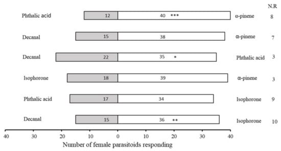 However, when given a choice between 100 ng/μL doses of HIPVs in a Y-tube olfactometer, A. varipes female parasitoids were significantly more attracted to α-pinene (χ2 = 15.077, df = 1, p < 0.0001) volatiles, followed by isophorone (χ2 = 8.647, df = 1, p = 0.003) and phthalic acid (χ2 = 2.965, df = 1, p = 0.085) (Figure 7).