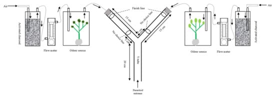 All olfactory responses tests were carried out in a glass Y-tube olfactometer, following Pan et al. [32] with some modifications (Figure 9). The olfactometer (both the stem and the two arms were 15 cm in length, with an internal diameter of 1.4 cm) was used to investigate the response of the parasitoid A. varipes to the five plant species with and without aphid infestation. For each plant host, the olfactory response was determined using clean air, un-infested plants (healthy plants or fresh seedlings) and aphid-infested plants (plants infested with 100 mixed-instar aphids on seedlings for 72 h before the test).