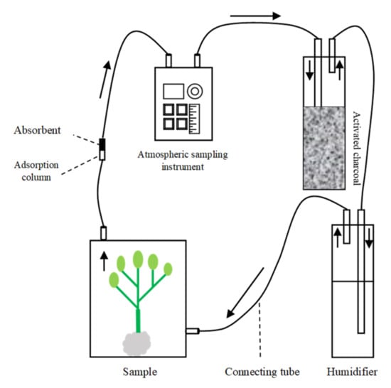 Dynamic headspace collection was used to collect volatile compounds individually from fresh seedlings (uninfected plants) and plant–aphid complexes (infected with aphids) (Figure 10). Before the collection of volatiles, individual plants were prepared, and the roots and bases of the plants were tightly wrapped with aluminum foil in order to minimize the contamination of soil-based volatiles. To collect the volatiles, plants were enclosed in a glass collection chamber (2.5 L) (Analytical Research Systems, Inc., Gainesville, FL, USA) for two hours before the experiment was started. Air was pulled through the trapping filters using an air-sampling pump (Dymax 5, Charles Austen Pumps Ltd., West Byfleet, UK). The air was cleaned with an activated charcoal filter, pumped at a rate of 300 mL−1 and drawn by the glass chamber through a Teflon tube. Air containing headspace volatiles was pulled out of the glass chamber through a trapping filter (outlet fitted) containing 200 mg of Porapak-Q adsorbent (Waters Corporation, Milford, MA, USA). Each experimental unit consisted of three replications. After each collection, Porapak-Q filters containing the volatiles were eluted with 200 μL of HPLC-grade hexane (Sigma Aldrich, Beijing, China), which ultimately provided a solution containing volatile compounds. Further, the solution was concentrated to 20 μL under a nitrogen stream and stored at −80 °C in a sealed vial for future analysis. Before each collection of headspace volatiles, all the mandatory glass wares were rinsed with distilled water and acetone, and the filters were washed with 3 mL hexane. Volatile collection lasted for 6 h, and each collection was performed in the morning from 9 a.m. until 3 p.m. at room temperature (25 ± 2 °C) and under natural light conditions.