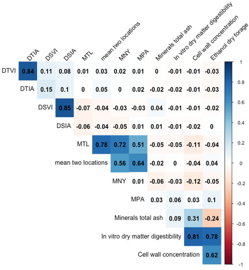 Correlation plot among BLUPs of severity from the detached leaf via vision (DTVI), via image analysis (DTIA), from leaf disk assay via vision (DSVI), via image analysis (DSIA), the highest score between two locations (MTL), mean from the two locations (TL), minerals total ash, in vitro dry matter digestibility, cell wall concentration, and ethanol conversion per day from a previous study [33].