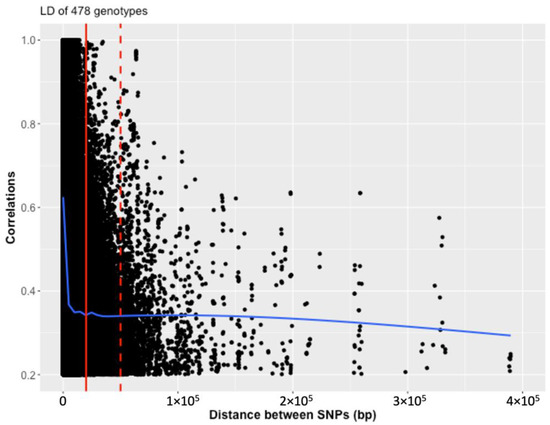 Scatter plot showing the linkage disequilibrium (LD) decay by plotting physical distance in base pairs against the LD estimate as correlations (R2) in 478 genotypes. The LD (blue curve) decays rapidly within 20 kb (solid red line) and reaches background levels around 50 kb (dashed red line).