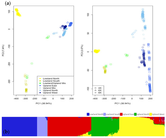 (a) The 478 switchgrass genotypes from the Northern Association Panel showed the different distributions based on ecotype and region from principal component analysis (PC). Colors represented different ecotypes, and shapes represented different ploidy levels. Percentage variances explained by PCs were in parentheses. The lowland ecotype can be differentiated into two regions from PC1 and PC2, and the upland ecotype can be grouped into three regions from PC1 and PC3. (b) Admixture also showed the separations of the genotypes into five gene pools.
