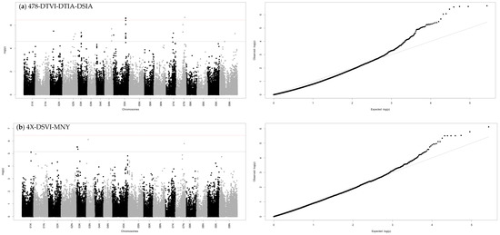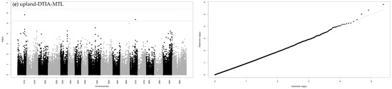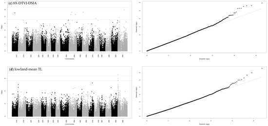 In a tetraploid group, the two-approached combination of DSVI and MNY provided three significant peaks with the expected QQ-plot (Figure 4b). Interestingly, one peak of SNP Chr07N_61547213 on chromosome 7N from tetraploid group overlapped with the same peak in GWAS from the 478 group. In the octaploid group, the two-approached combination of DTVI-DSIA showed one significant peak on chromosome 9N (Figure 4c). In the lowland group, the best GWAS was from the single trait mean of two locations yielding eight peaks (Figure 4d). In the upland group, the combination of DTIA-MTL gave the two most significant peaks on chromosome 1k and 7K (Figure 4e).