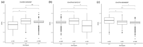 Examples of changes in DSIA associated with alleles at selected candidate SNP among 478 genotypes. The “*” behind the SNP names mean P. virgatum genes that overlap with the BLAST hits from BLS resistance genes from Oryza sativa. (a) Chr05K.5450256 showed a dominant effect. (b) Chr07N.61547213 showed an overdominant effect. (c) Chr07N.48546809 showed an additive effect. The effects of three different allele combinations were tested at alpha = 0.05. “ns” means non-significant, “*” means significant at alpha 0.05, “**” means significant at alpha 0.01, “***” means significant at alpha 0.001, and “****” means significant at alpha 0.0001.