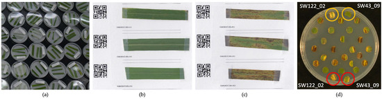 Detached leaf assay and leaf disk assay; (a) sealed plates of detached leaves under 12-h light 25 °C; (b) control inoculated and (c) inoculated leaves at seven dpi were taped on white paper with QR code label for scanning for image analysis. (d) A plate example of leaf disk assay at seven dpi. Each plate consisted of 28 leaf disks. SW43_09 was used as a resistant check and SW122_02 as a susceptible check. Two control leaf disks (yellow circles) and two inoculated leaf disks (red circles) were included in all plates. The rest of the leaf disks (24) consisted of eight genotypes with three replicates placed in a consecutive row from left to right.
