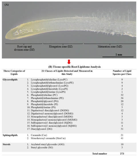Tissue-specific root lipidome of Young (cold-tolerant) and Wyalkatchem (cold-sensitive) wheat varieties in this study. (A) The three developmental root zones of a Wyalkatchem’s young seedling. DZ = root cap and division zone, EZ = elongation zone, MZ = maturation zone. (B) A total of 273 lipid species derived from 21 lipid classes and three lipid categories (glycerolipids, sphingolipids and sterols) analyzed in this study.