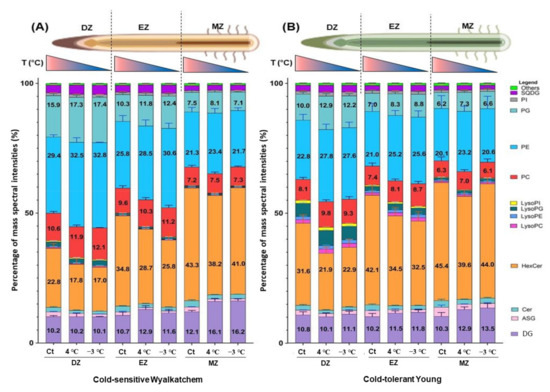 The DZ is closest to the root tip, and it is made up of actively dividing cells of the root meristem. Of the three root development zones, the EZ is where the newly formed cells increase in length and stimulate root growth. Once the cells have reached their final size at the end of the EZ, they will enter the MZ, which is marked by the beginning of root hair formation, where root cells begin to differentiate into special cell types [49]. In cold-sensitive Wyalkatchem and cold-tolerant Young, it was found that both varieties shared similar patterns of lipid composition at the unstressed stage. Phosphoglycerolipids such as PE, PG, PC, and their lyso species occupied more than 50% of the total lipid composition in the DZ where cells are actively dividing. The percentage gradually decreased across the EZ and was the lowest for the MZ. Conversely, sphingolipids such as HexCer and Cer were the lowest in the DZ for both varieties, then gradually increasing across the EZ and becoming the prevalent category of lipids in the MZ (40% of total measured lipid).