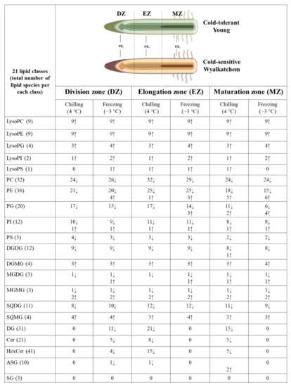 Varietal differences of the lipid profiles of three developmental root zones between Young and Wyalkatchem following chilling and freezing stress treatment. (↑ significantly higher; ↓ significantly lower).
