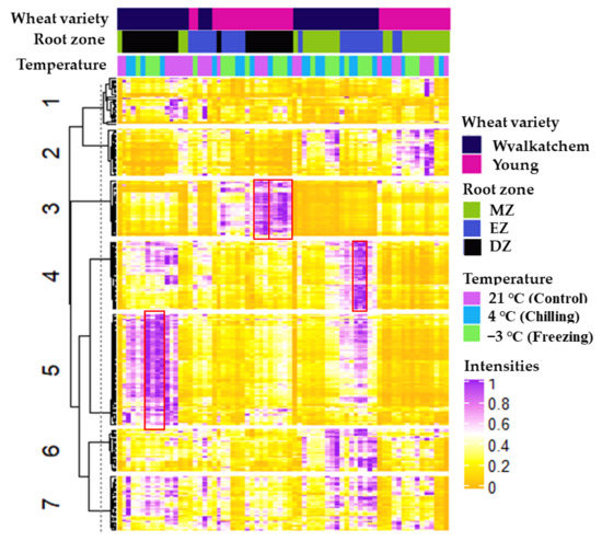 Bootstrapped hierarchical clustering analysis (HCA) of lipid autoscaled intensities from all the root samples (control and subjected to cold stress for three developmental root zones) of cold-sensitive Wyalkatchem and cold-tolerant Young varieties. Rows were clustered using K-means with K equal to 7, and with n clustering reiterations (n = 1000). R packages ComplexHeatmap and pvclust were used to do and extract the heatmap image [52,53].