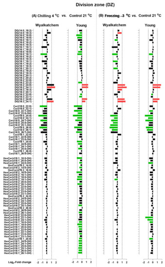 Log2-fold changes of DG, Cer, and HexCer species in the division zone (DZ) of cold-sensitive Wyalkatchem and cold-tolerant Young after exposure to (A) chilling and (B) freezing stress. Statistical significance was determined using an FDR-adjusted p-value of 0.05 as the cut-off. Green bar = significant decrease; Red bar = significant increase. Black bar represents lipid species that has no significant change after cold stress as compared to control. n = 4.