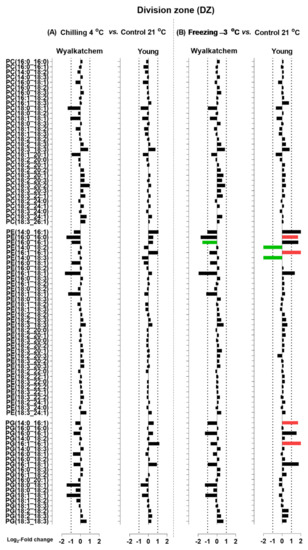 Log2-fold changes of PC, PE and PG species in the division zone (DZ) of the cold-sensitive Wyalkatchem and cold-tolerant Young after exposed to (A) chilling and (B) freezing stresses. Statistical significance was determined using an FDR-adjusted p-value of 0.05 as the cut-off. Green bar = significant decrease; Red bar = significant increase. Black bar represents lipid species that has no significant change after cold stress as compared to control. n = 4.