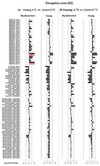 Next, the chilling and freezing effects on the elongation zone (EZ) of Wyalkatchem and Young for lipid species of the HexCer, Cer, and DG classes are shown in Figure 7, and those for lipid species of the PC, PE, and PG classes are shown in Figure 8. Chilling and freezing did not cause any significant changes in sphingolipids (Cer and HexCer) in the EZ of Wyalkatchem and Young (Figure 7). Chilling and freezing also did not cause any significant changes of DG in the EZ of Wyalkatchem and Young, except only two DG species that were significantly increased after chilling exposure in Wyalkatchem: DG(18:2_24:1) and DG(18:3_24:1) (Figure 7A). The most obvious effects of chilling and freezing on the EZ were observed in phosphoglycerolipids from the PC, PE, and PG classes, of which many of the lipid species were significantly increased in cold-sensitive Wyalkatchem after cold stress. Chilling caused the increase of 16 PC species in Wyalkatchem, five of which were increased more than +2.0-fold (Figure 8A). The five PC species were PC(18:3_18:3), PC(18:3_20:2), PC(18:3_22:1), PC(18:3_24:1), and PC(18:3_26:1). Chilling also induced the increase of 18 PE species in the EZ of Wyalkatchem, but only three of them were increased more than +2.0-fold: PE(18:3_18:3), PE(18:3_20:3), and PE(18:3_24:1). Nine PG species were increased in the EZ after chilling, but only one PG(18:3_18:3) was increased more than +2.0-fold (Figure 8A). Freezing caused even more significant changes to the PC, PE, and PG species in the EZ of Wyalkatchem compared to chilling (Figure 8B). A total of 24 PC species were significantly increased, with seven of them more than +2.0-fold. The PC species were PC(18:0_18:3), PC(18:3_18:3), PC(18:3_20:1), PC(18:3_20:2), PC(18:3_22:1), PC(18:3_24:1), and PC(18:3_26:1). Twenty-six PE species were increased, with ten of them by more than +2.0-fold: PE(18:0_18:3), PE(18:1_18:3), PE(18:2_18:3), PE(18:3_18:3), PE(18:3_20:1), PE(18:2_20:3), PE(18:3_22:0), PE(18:3_22:1), PE(18:3_24:0), and PE(18:3_24:1). One PE species was significantly decreased in the EZ of Wyalkatchem after freezing stress, i.e., PE (16:0_16:1). As for PG, ten species were increased in the EZ after freezing stress, but only two species by more than +2.0-fold: PG(18:2_18:3) and PG(18:3_18:3). One PG species was significantly decreased in this zone following freezing stress: PG(16:0_16:1) (Figure 8B). For the EZ of Young, chilling did not cause any significant changes to the PC, PE, and PG (Figure 8A), but freezing did have some significant effects (Figure 8B). Two PC species were significantly increased after freezing stress, but the changes were less than +2.0-fold. Four PE species were significantly increased and only two of them by more than +2.0-fold: PE(16:1_16:1) and PE(18:3_18:3). One PG species, PG(18:3_18:3), was significantly increased in this root zone by freezing stress, but by less than +2.0-fold change (Figure 8B).