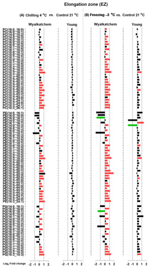 Log2-fold changes of PC, PE and PG species in the elongation zone (EZ) of the cold-sensitive Wyalkatchem and cold-tolerant Young after exposed to (A) chilling and (B) freezing stresses. Statistical significance was determined using an FDR-adjusted p-value of 0.05 as the cut-off. Green bar = significant decrease; Red bar = significant increase. Black bar represents lipid species that has no significant change after cold stress as compared to control. n = 4.
