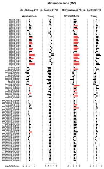 Figure 5 shows the chilling and freezing effects on the DZ of Wyalkatchem and Young for lipid species of the HexCer, Cer, and DG classes. In Wyalkatchem, after exposure to chilling stress, DG(18:0_18:1) was the only DG species that decreased in the DZ, while DG(18:2_24:1) and DG(18:3_24:1) were both increased (Figure 5A). Compared to chilling, exposure to freezing stress caused more significant changes of DG species in the DZ of Wyalkatchem (Figure 5B). Four DGs were decreased in this zone, two of them more than −2.0-fold: DG(18:0_18:1) and DG(18:1_18:1). Five DGs were increased after freezing stress and four of these increased more than +2.0-fold: DG(18:2_24:0), DG(18:2_24:1), DG(18:3_24:0), and DG(18:3_24:1) (Figure 5B). After exposure to chilling stress, nine DG species decreased in the DZ of Young, three of which increased more than −2.0-fold: DG(16:0_16:0), DG(16:0_18:0), and DG(18:0_18:1) (Figure 5A). Compared to chilling, exposure to freezing stress caused less significant changes of the DG species in the DZ of Young (Figure 5B). Four DGs were observed to decrease in this zone, but all by less than −2.0-fold. Meanwhile, four DGs were observed to increase more than 2.0-fold after freezing stress: DG(18:2_24:0), DG(18:2_24:1), DG(18:3_24:0), and DG(18:3_24:1) (Figure 5B). Chilling and freezing also caused significant decreases of sphingolipids (Cer and HexCer) in the DZ of Wyalkatchem and Young (Figure 5). Chilling stress reduced four Cer species by more than −2.0-fold and no significant changes of HexCer species were found. The four Cer species were Cer(t18:0_22:0), Cer(t18:0_24:0), Cer(t18:0_24:1-OH), and Cer(t18:0_26:0) (Figure 5A). Compared to chilling stress, freezing caused an even stronger decrease of Cer species in the DZ of Wyalkatchem and seven species were involved (Figure 5B). Of these, six were decreased by more than −2.0-fold: Cer(t18:0_24:0), Cer(t18:0_24:1-OH), Cer(t18:0_25:0-OH), Cer(t18:0_25:1-OH), Cer(t18:0_26:0), and Cer(t18:0_26:1). One HexCer (HexCer(d18:2_18:1-OH) was decreased in the MZ following exposure to freezing stress, but the decrease was less than −2.0-fold (Figure 5B). Chilling caused many significant decreases of Cer (11) and HexCer species (21) in the DZ of Young (Figure 5A). Of the eleven Cer species, eight were decreased greater than −2.0-fold: Cer(18:0_22:0), Cer(t18:0_22:1-OH), Cer(t18:0_24:0), Cer(t18:0_24:1), Cer(t18:0_24:1-OH), Cer(t18:0_26:0), Cer(t18:0_26:1-OH), and Cer(t18:1_24:0). Of the 21 HexCer species, only six were decreased by more than −2.0-fold: HexCer(d18:1_16:0-OH), HexCer(d18:2_16:0-OH), HexCer(d18:2_18:0-OH), HexCer(d18:2_18:1-OH), HexCer(d18:2_20:1-OH), and HexCer(t18:1_18:0-OH) (Figure 5A). Freezing stress had less of an effect on Cer and HexCer compared to chilling in the DZ of Young (Figure 5B). Six Cer and five HexCer were significantly decreased following freezing stress. Of the six Cer species, five were decreased by more than −2.0-fold: Cer(t18:0_24:1), Cer(t18:0_24:1), Cer(t18:0_24:1-OH), Cer(t18:0_26:0), and Cer(t18:0_26:1). Two HexCer decreased by more than −2.0-fold: HexCer(t18:0_22:1-OH) and HexCer(t18:1_24:1-OH) (Figure 5B). Neither chilling nor freezing stress caused many significant changes of phosphoglycerolipids (PC, PE, and PG) in the DZ of both Wyalkatchem and Young (Figure 6). While chilling did not cause any significant changes to PC, PE, or PG levels in both varieties (Figure 6A), freezing caused a decrease of only one PE in Wyalkatchem (PE(16:0_16:1). In Young, freezing caused the decrease and increase of two of PE species: PE(14:0_18:2) and PE(14:0_18:3), respectively (Figure 6B). The increased PE species were PE(16:0_16:0) and PE(16:1_16:1). Freezing also caused the increase of two PG species in the DZ of Young: PG(16:0_16:0) and PG(16:1_16:1) (Figure 6B).