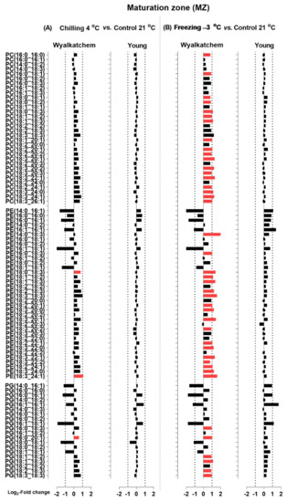 Log2-fold changes of PC, PE and PG species in the maturation zone (MZ) of the cold-sensitive Wyalkatchem and cold-tolerant Young after exposed to (A) chilling and (B) freezing stresses. Statistical significance was determined using an FDR-adjusted p-value of 0.05 as the cut-off. Green bar = significant decrease; Red bar = significant increase. Black bar represents lipid species that has no significant change after cold stress as compared to control. n = 4.