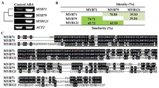 MYB71 and its closely related genes MYB79 and MYB121 are ABA responsive genes. (A) Expression of MYB71, MYB79 and MYB121 in response to ABA. Ten-day-old Col wild type seedlings were mock treated or treated with 50 µM ABA for 4 h, total RNA was isolated, and cDNA was synthesized and used for RT-PCR analysis. ACT2 was used as a control. (B) Percentage of amino acid identity and similarity of MYB71, MYB79 and MYB121. Full-length amino acid sequences of MYB71, MYB79, and MYB121 were subjected to SIAS (http://imed.med.ucm.es/Tools/sias.html, accessed on 25 May 2018) for amino acid identity and similarity assay. (C) Amino acid sequence alignment of MYB71, MYB79, and MYB121. Identical amino acids were shaded in dark, and similar ones in gray. Underlines indicate the R2R3 MYB repeats.
