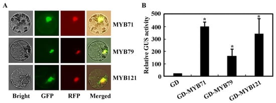 To generated constructs for the subcellular localization assay, the GD tag in the GD-MYB71, GD-MYB79 and GD-MYB121 constructs were replaced with a GFP tag to generated GFP-MYB71, GFP-MYB79 and GFP-MYB121 constructs respectively. The NLS-RFP nuclear indicator was as described previously [68].
