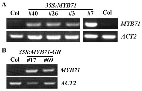 Expression of MYB71 in the 35S:MYB71 and 35S:MYB71-GR transgenic plants. (A) Expression of MYB71 in the 35S:MYB71 transgenic plants. (B) Expression of MYB71 in the 35S:MYB71-GR transgenic plants. Total RNA was isolated from 10-day-old homozygous transgenic plants and RT-PCR was used to examine the expression of MYB71. Expression of ACT2 was used as a control.