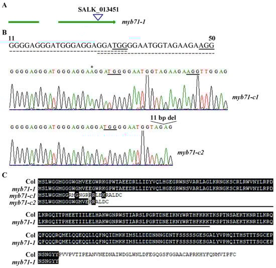 Since there is only one T-DNA insertion mutant, we decided to generate gene edited mutants for MYB71 by using CRISPR/Cas9 gene editing, a method that can be used to generate transgene-free mutants [50,51,52,53]. Two overlapped target sequences near the start the condon of MYB71 was selected (Figure 4B), and gene editing construct was generated and used for plant transformation. By sequencing the MYB71 gene in the transgenic plants, and isolated transgene-free mutants based on the PCR amplification of Cas9 vector fragment, we successfully obtained two transgene-free MYB71 mutants (i.e., myb71-c1 and myb71-c2).