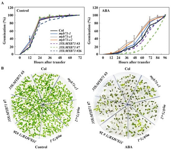 ABA inhibited seed germination and cotyledon greening were used to examine ABA response of the overexpression transgenic plants and gene edited mutants of MYB71, by using a procedure described previously [35,75,76,77]. Briefly, seeds of the Col wild type, the 35:MYB71 overexpression transgenic plants and MYB71 mutants were sterilized and sowed on the 1/2 MS plates containing 1 µM ABA, or the solvent methanol as control. The plates were kept at 4 °C for 2 days in darkness and then transferred into the growth room. The numbers of seeds germinated were counted every 12 h, and photographs were taken 12 days after the transfer.