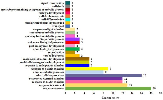 Functional categorization of the different expressed genes. The 26 genes up-regulated at least 2 folds in 35S:MYB71-GR transgenic plant treated with DEX were used for functional categorization annotation by using TAIR gene ontology (GO) annotation (https://www.arabidopsis.org/tools/bulk/go/index.jsp, accessed on 14 September 2021). The number of genes in different biological process was indicated.