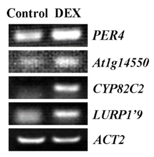 Among the 26 upregulated genes in DEX treated 35S:MYB71-GR transgenic seedlings, we found several genes have been functional characterized, for example, LURP1 and CYP82C2 are involved in pathogen defense [54,55,56], PER4 has been shown to regulated seed germination [57,58], and At1g14550 is a tandem repeat gene of PER4, and encodes a protein closely related to PER4 [57]. We therefore take these genes as examples to compare their expression in DEX treated and control seedlings. As shown in Figure 7, the expression levels of all of the four genes were clearly increased in DEX treated seedlings.