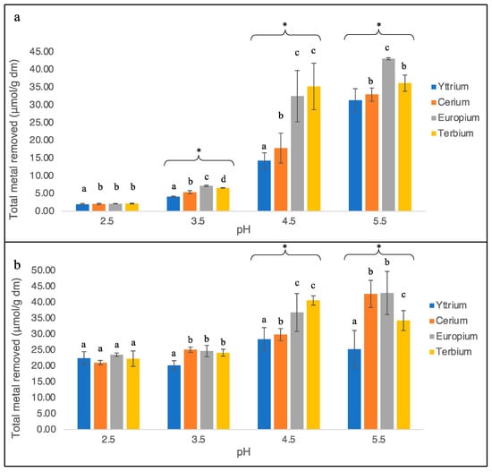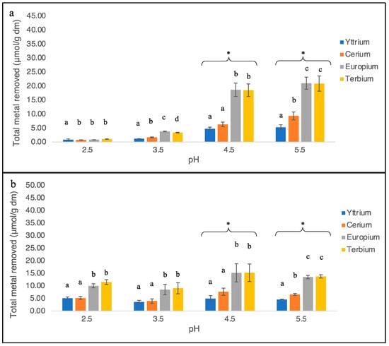 A further increase in the pH at 4.5 deeply influenced the removal rates for both strains as already shown in the single-metal systems, even if to a lesser extent. Metal quantities removed by SAG 107.79 at pH 4.5 were 4.69 ± 0.60 µmol/g of Y3+, 6.28 ± 0.84 µmol/g of Ce3+, 18.63 ± 2.39 µmol/g of Eu3+, and 18.48 ± 2.26 µmol/g of Tb3+ (Figure 3a). Comparable quantities were also registered in ACUF 427 (Y3+ = 4.92 ± 1.15 µmol/g, Ce3+ = 7.64 ± 1.40 µmol/g, Eu3+ = 15.17 ± 3.61 µmol/g, Tb3+ = 15.20 ± 3.50 µmol/g; Figure 3b). Finally, at pH 5.5, a slight increase in the metals accumulated was recorded, even if not significantly compared to the previous pH. The total metals removed were 5.26 ± 0.91 µmol/g of Y3+, 9.32 ± 1.41 µmol/g of Ce3+, 20.98 ± 2.17 µmol/g of Eu3+, and 20.85 ± 2.72 µmol/g of Tb3+ for SAG 107.79 (Figure 3a) and 4.58 ± 0.12 µmol/g of Y3+, 6.59 ± 0.38 µmol/g of Ce3+, 13.50 ± 0.68 µmol/g of Eu3+, and 13.74 ± 0.64 µmol/g of Tb3+ for ACUF 427 (Figure 3b).