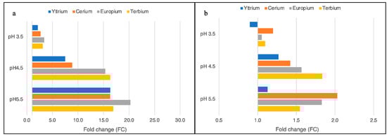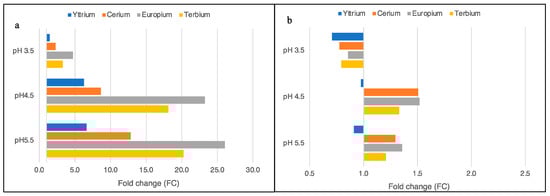 Using the SAG 107.79 strain, the comparison of the metal quantities at pH 3.5, 4.5, and 5.5 with those at pH 2.5 highlighted a significant increase in the Yttrium removal at pH 4.5 (FC = 6.3), and it remained almost unchanged at pH 5.5 (FC = 6.6). Unlike Yttrium, the ulterior increase in the pH to 5.5 more deeply affected the removal of Ce3+, Eu3+, and Tb3+, even if the rates changed among the metal species (Figure 4a). Indeed, the Cerium quantities increased 2.3 FC at pH 3.5, 8.6 FC at pH 4.5, and 12.8 FC at pH 5.5. Significantly higher quantities were registered for Europium, whose removal rates increased 4.7 times at pH 3.5, 23.3 times at pH 4.5, and up to 26.1 times at pH 5.5 (Figure 4a). As shown for the other metals, the pH solution of 4.5 most influenced the removal of Tb3+, increasing the metal quantity of 18.1 FC, while the removed Terbium at pH 5.5 was comparable to that at the previous pH (20.3 FC; Figure 4a).