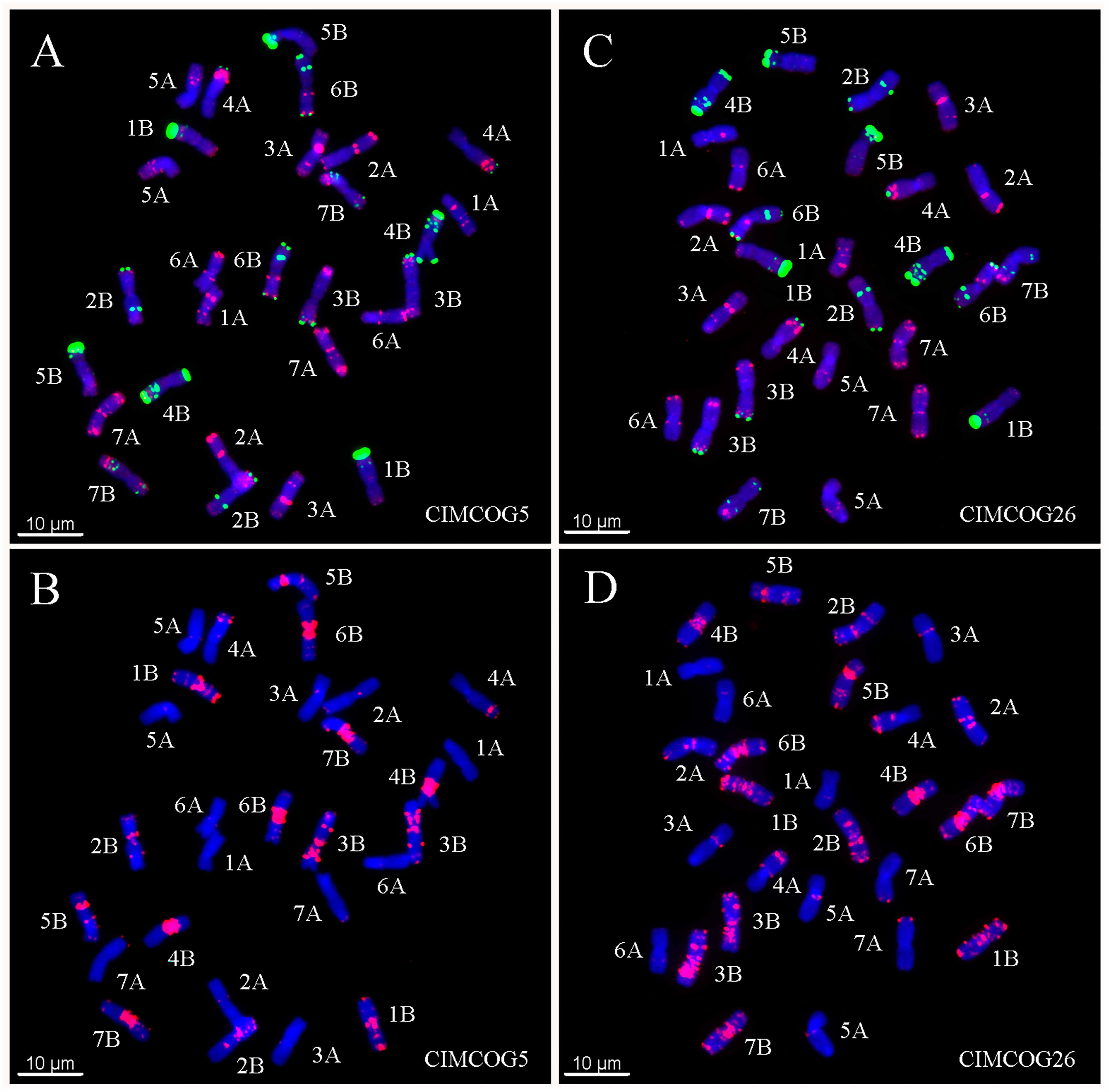 2.2. ND-FISH Polymorphisms of A-, B-, and D-Genome Chromosomes