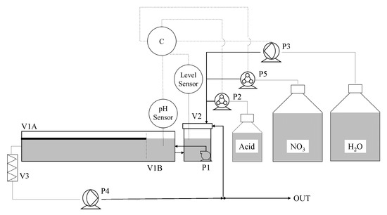 where F is the molar flow rate of nitrate-nitrogen fed into the tank in mmol·d and F is the molar flow rate of nitrate-nitrogen measured in the liquid medium in mmol·d. A schematic diagram is given in Figure 1. Due to Run 1, Run 2 and Run 3 being operated in batch, pump P4, filter V3 and the outlet were not used. All instruments were used while operating continuously.